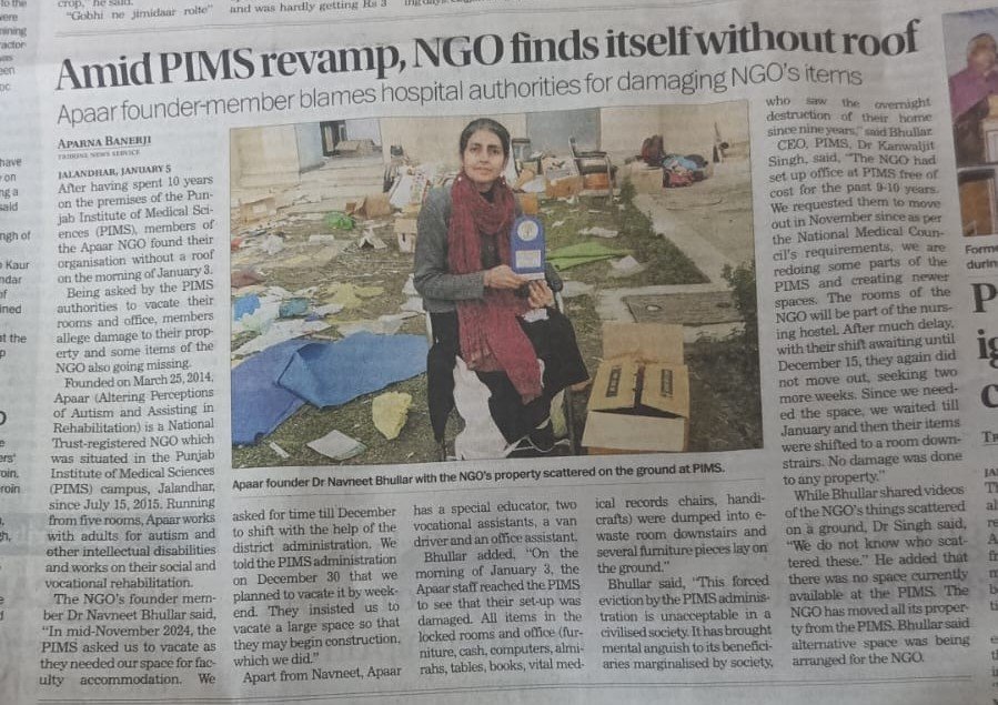 APAAR was established in March 2014 in a room in a rented house in Model Town, Jalandhar. Few weeks later we moved to a two storeyed shop in Chhoti Baradari which the owner kindly provided us rent free until July 2015. We moved to the Punjab Institute of Medical Sciences on 16 July, 2015, thanks to the benevolence of their Director, Dr Kanwaljit Singh and the managing Committee. We are on the fourth floor with a 270-degree view through glass windows that fully cover two sides .