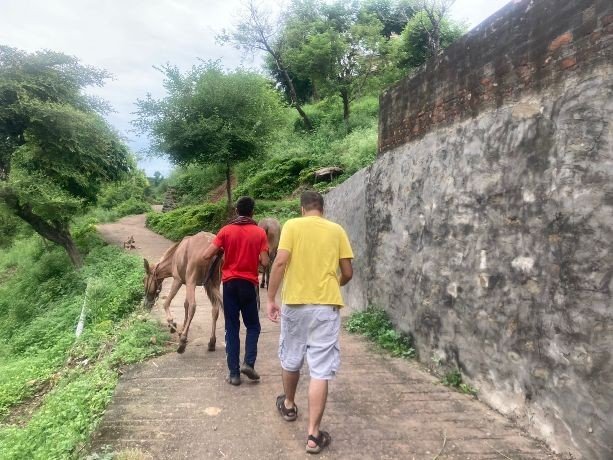 He took long post dinner walks in the forest rest house. He sat by Tikkar taal where youngsters played music by the lake shimmering in lights. He and I trekked to a village nearby, Luv was unperturbed when he shared the narrow road with two horses. Horses Luv is not used to. Dogs and cows he sees on the streets and his neighborhood park all the time .